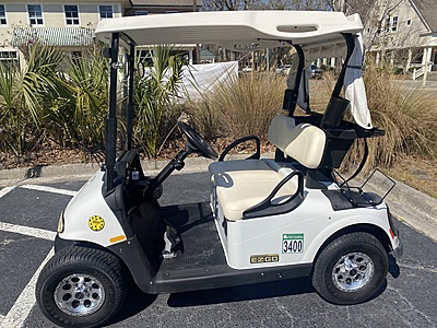 Existing items on car include: 2024 12v Batteries Head / Tail / Brake lights Energy Meter Beige Standard Seats 10" Tires / Wheels w/ Covers White Top Assy Club Protector Beverage Tray Side Mirrors Hinged Windshield Side Basket Used Golf Car, Sold as is.